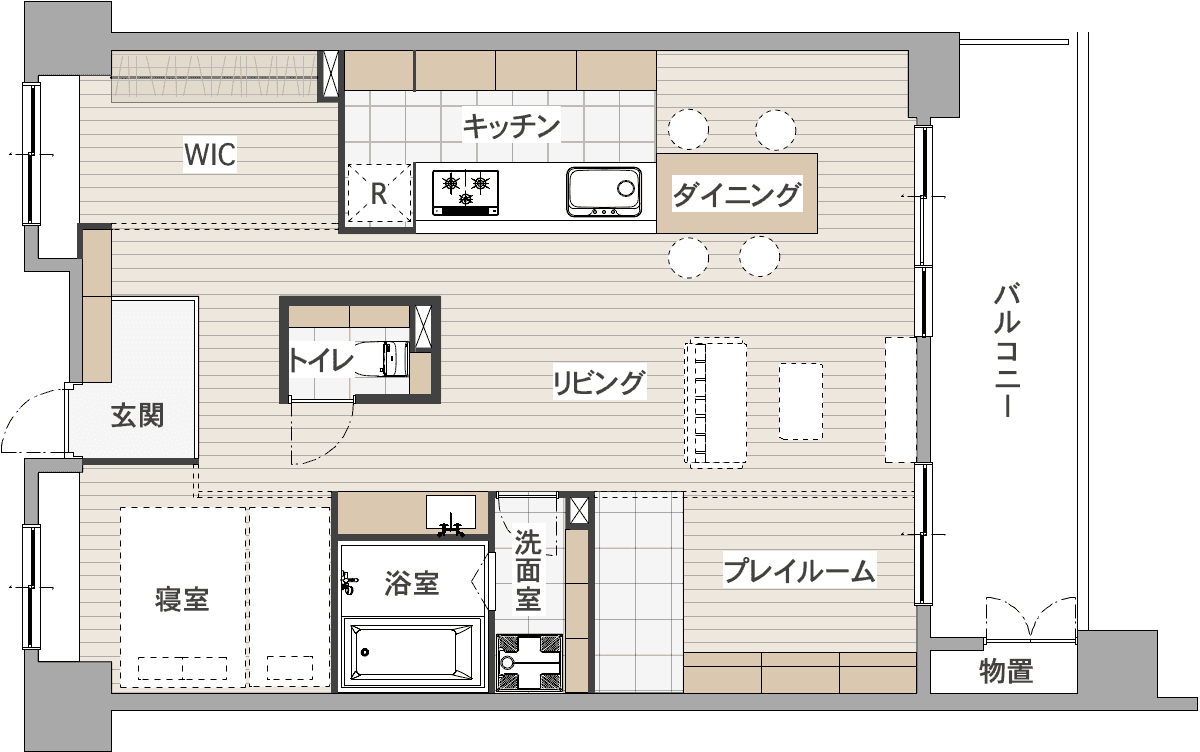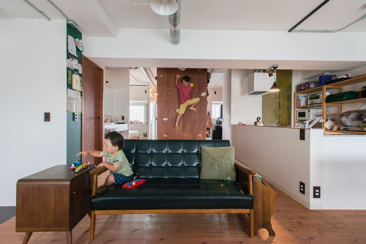 ボルダリングの壁や床の段差など子供達が遊べる仕掛けがたくさん詰まった楽しい家。位置が固定のトイレは回遊型プランの中心として利用し、キッチンとダイニングは一直線上に配して家事効率をアップさせました。廊下のないプランで収納や勉強スペースも効率よく設けています。