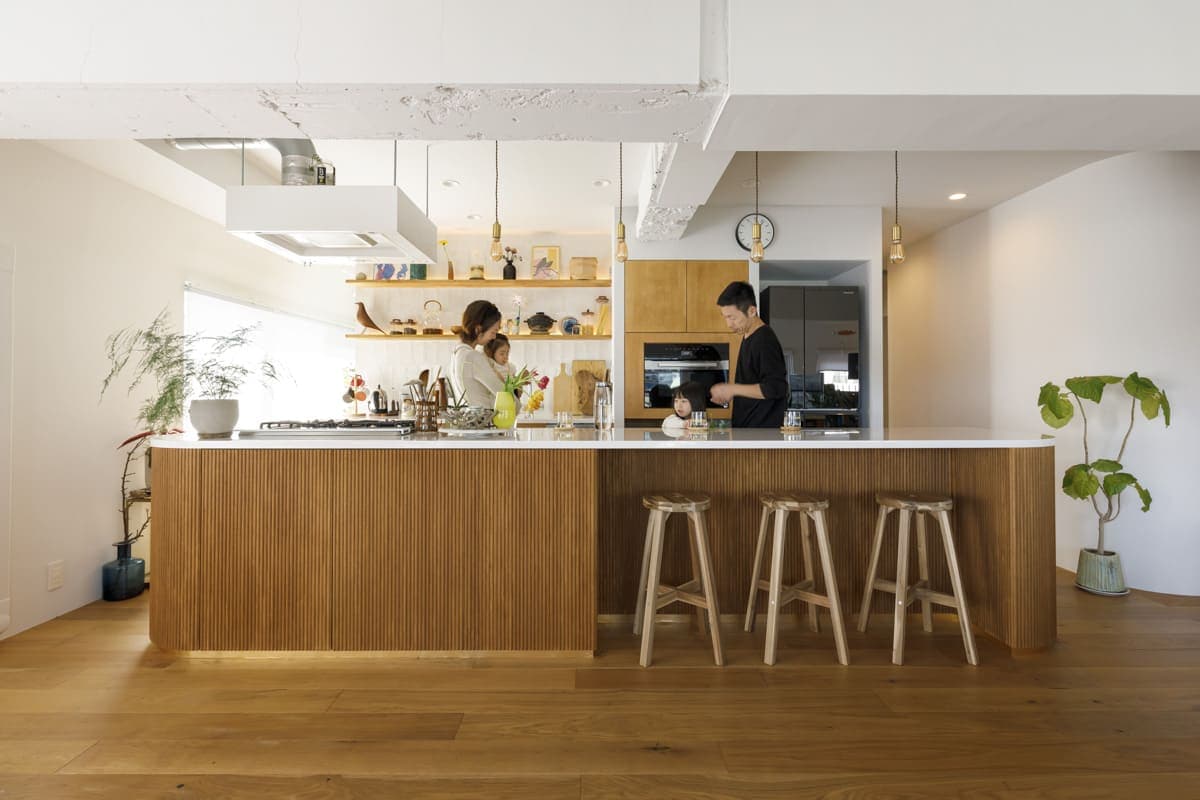 空間を印象づける4m幅のカウンターは、家族はもちろん親族や友人が集まる場となり、暮らしに変化をもたらした。
