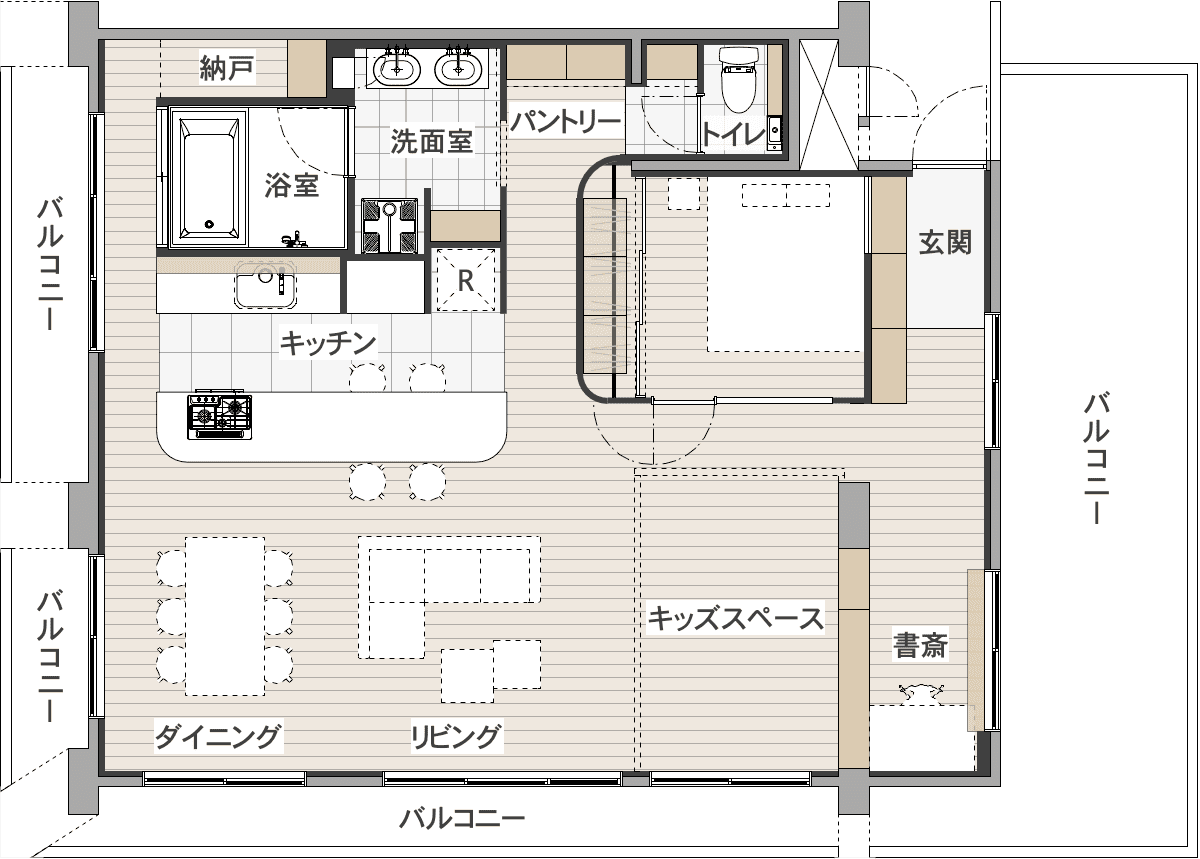 <ご主人> 3面開口を活かした、明るくて風通しが良い間取りにしたいということと、妻の希望の窓付きのお風呂と広いキッチンを一番大切にしてあげたいと思っていました。 <奥さま> 窓つきのユニットバスは私の一番の希望でした。閉塞感のないお風呂で、窓の外の景色を眺めながら入浴がしたかったんです。 <ご主人> 子どもたちとの関わり方を閉塞的にしたくなかったので寝室は1つにして、今は家族揃って寝ています。娘たちに部屋が必要になった時は、部分リフォームで子ども部屋をつくる計画です。